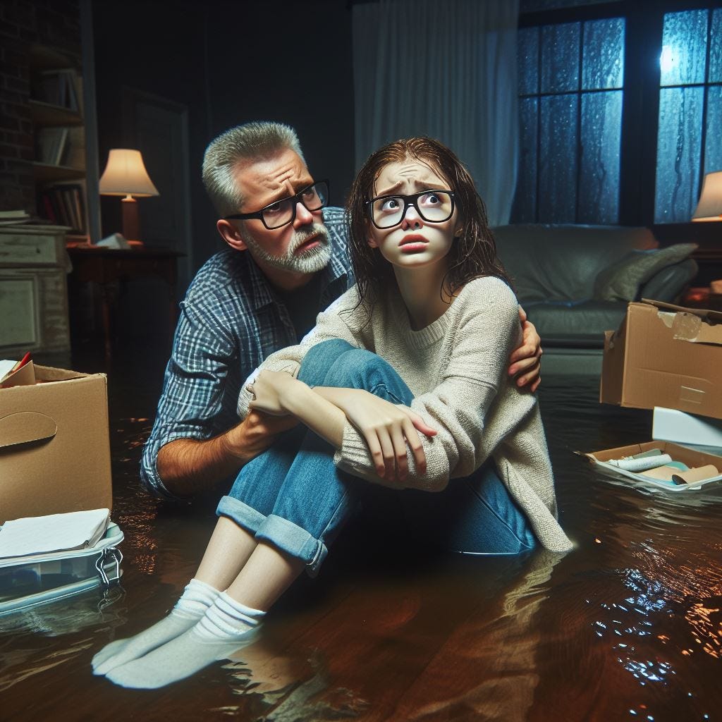 “We have to try and get out of here,” James concludes firmly, feeling the protective adrenaline of both husbandry and fatherhood being released into his veins. Taking nothing but an extra pair of clothing each and some light toiletries, James leads his wife, daughter, and father out the front door. The rain outside was already battering fiercely, coming down obliquely. Sprinting across the front yard and driveway, the Douglas family piles into James’ SUV. They are already shivering; and whether this is more from the wet cold, or their intense trepidation, is indistinguishable.