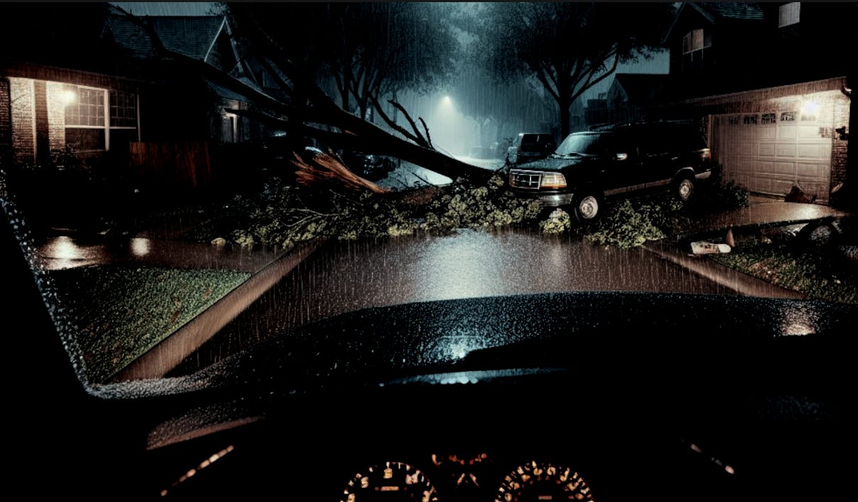 The drive out of Old Meribeth is almost immediately stalled. While power to the streetlamp has been maintained up until this point, Imani’s winds are already tearing at the dense clusters of oak tree canopies throughout Hampton’s neighborhoods. Leaves and twigs rain down in a downpour nearly as dense as the Hurricane’s; the debris clatters on the Douglas’ car, sounding like pea-sized hail. They pass streets that are hopelessly blocked with honking horns and peppermint lights… while others seem completely abandoned.