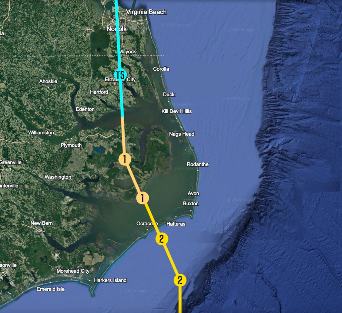 It’s 4 pm EDT, September 9th, and the incredibly massive Hurricane Imani is just 18 hours from landfall. The U.S. Navy evacuates their final ships from Norfolk Naval Station, while Interstate 64, heading out of Virginia Beach, becomes bogged down in absolute gridlock. Chaos reigns on the roads as the fatalistic realization sinks in. Mouths gape, and throats swallow at the sight of Imani’s unregulated extremeness. New storm surge predictions roll in, with the heaviest impacts now moving north of North Carolina. Along the Chesapeake Bay, catastrophic scenarios of 14-20 feet of surge are deemed possible on the southwestern shore. The densely packed suburban neighborhoods of Norfolk and Hampton Roads, in particular, are scrutinized to be under imminent, potentially unsurvivable danger. Meanwhile, in Kitty Hawk and Nags Head, the surge forecast flips sides of the barrier island. 9-12 feet of inundation is still expected, but from the brackish waters of the Currituck, Pamlico, and Albemate Sounds, not the Atlantic side. Perhaps the only ‘good’ news comes for the islands to Rodanthe’s south, where surge could still be life-threatening, but is no longer anticipated to be severely damaging in the absence of a direct hit from Imani. As for Morehead City and those to the south, the sudden change in track for the Hurricane practically evaporates their chances for any measurable storm surge (they will be on the opposite side of the storm, where the prevailing wind will actually push the water out to sea).