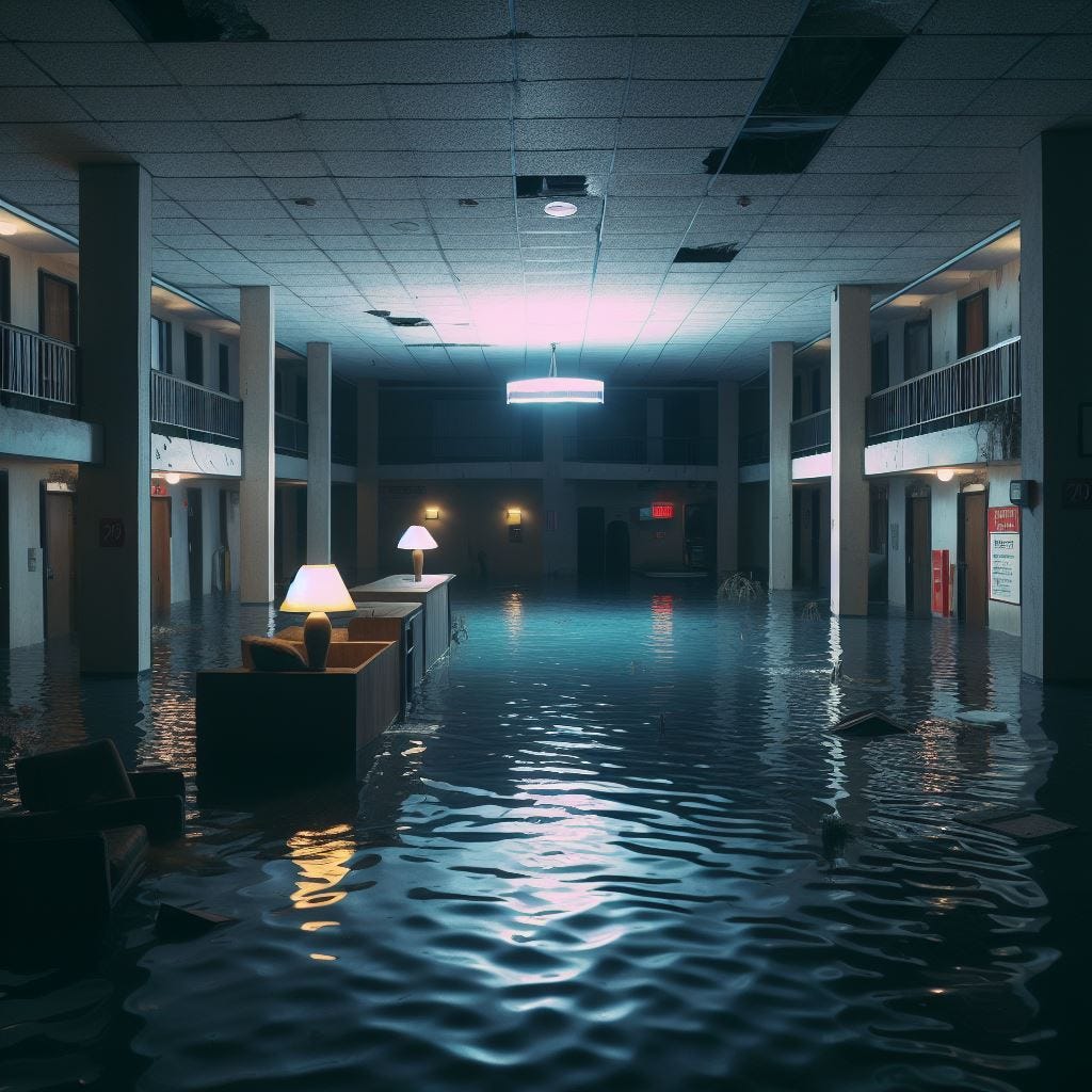Water surges into the ground floors of the beachfront resorts. It breaches the meager sandbag piles with an effortless sweep of its heavy hands, flooding lobbies in a deep, dark, mysteriously terrifying pool of debris-strewn seawater. The magnificent, beach-front windows fluctuate and rattle, like the shaking of a rattlesnake’s tail, under the threatening tread of the wind. In ground story motels, people wake up to find their rooms completely filled in a cold, salty slush. Panicking, they roll into the water, wade through its waist-deep depths, burst out of their doors, and flee to the stairwells.