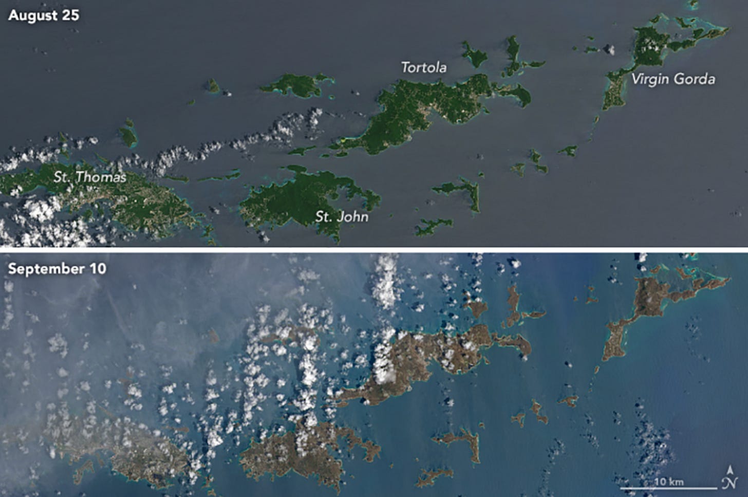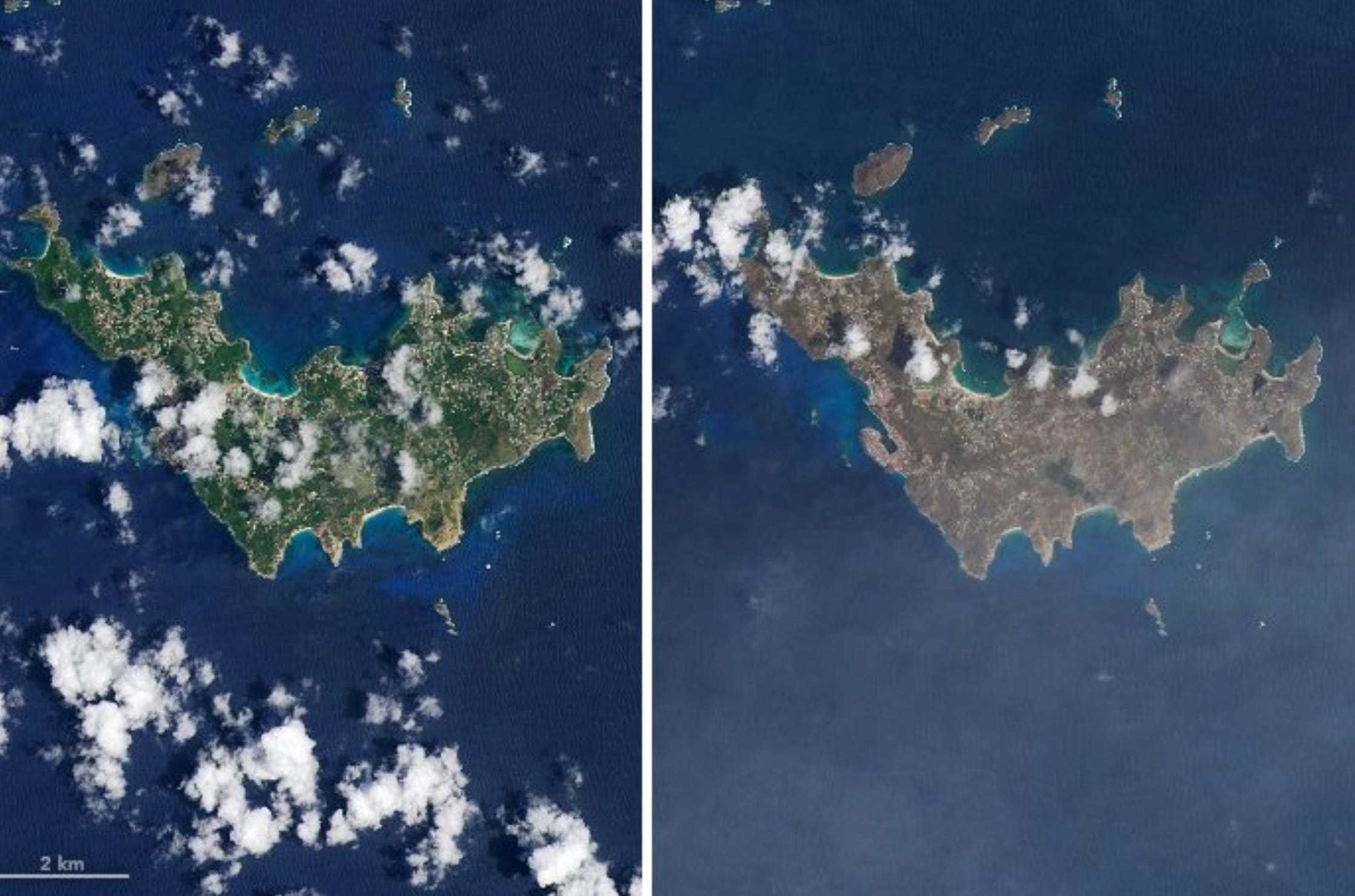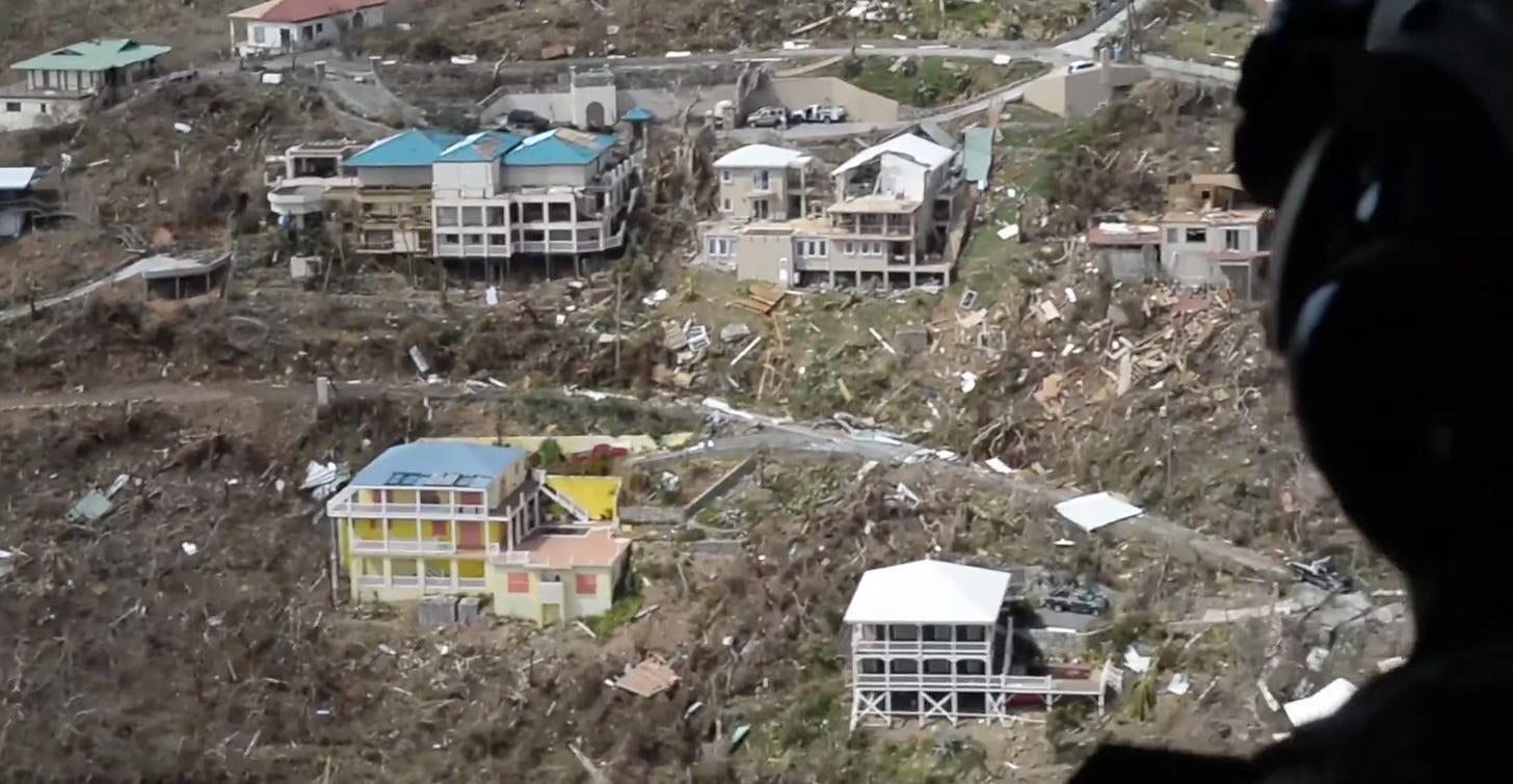 At the stroke of midnight later that evening, September 6th finally came to a shuttering close, ending what would become one of the most infamous days in Atlantic Hurricane history. In that single, 24-hour period, much of the ~300 miles between Codrington, Barbuda and San Juan, Puerto Rico had been butchered by the strongest landfalling Hurricane since the 1930s. Of the most extensively damaged islands, exactly 301.5 square miles of lush, tropical forests had either been chopped down by hellishly strong wind gusts, or burned away by corrosive saltwater mist in the air; and the corresponding human infrastructure, was nearly eradicated.