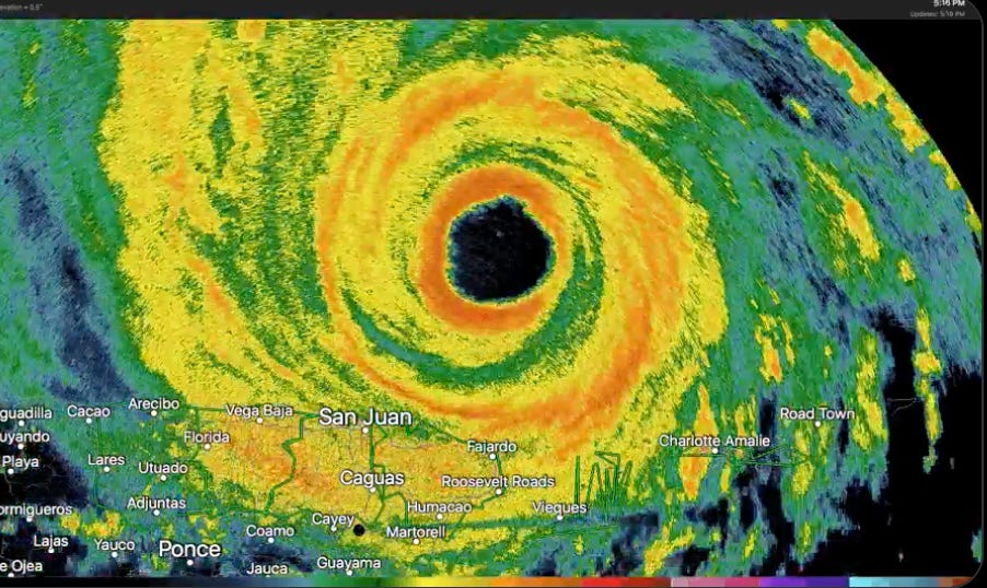 Earlier that day (September 6th), during her landfalls in St. Martin and the British Virgin Islands, the Hurricane’s central pressure had actually weakened slightly off the <916 millibars that had been observed directly on Barbuda. However, by late afternoon, Irma’s core started deepening a second time, again down to a surface air pressure of 914 millibars. This occurred despite the very clear presence of two eyewalls implanted in the storm’s arctic-cold CDO, a feature revealed when Irma came within range of Puerto Rican radar.