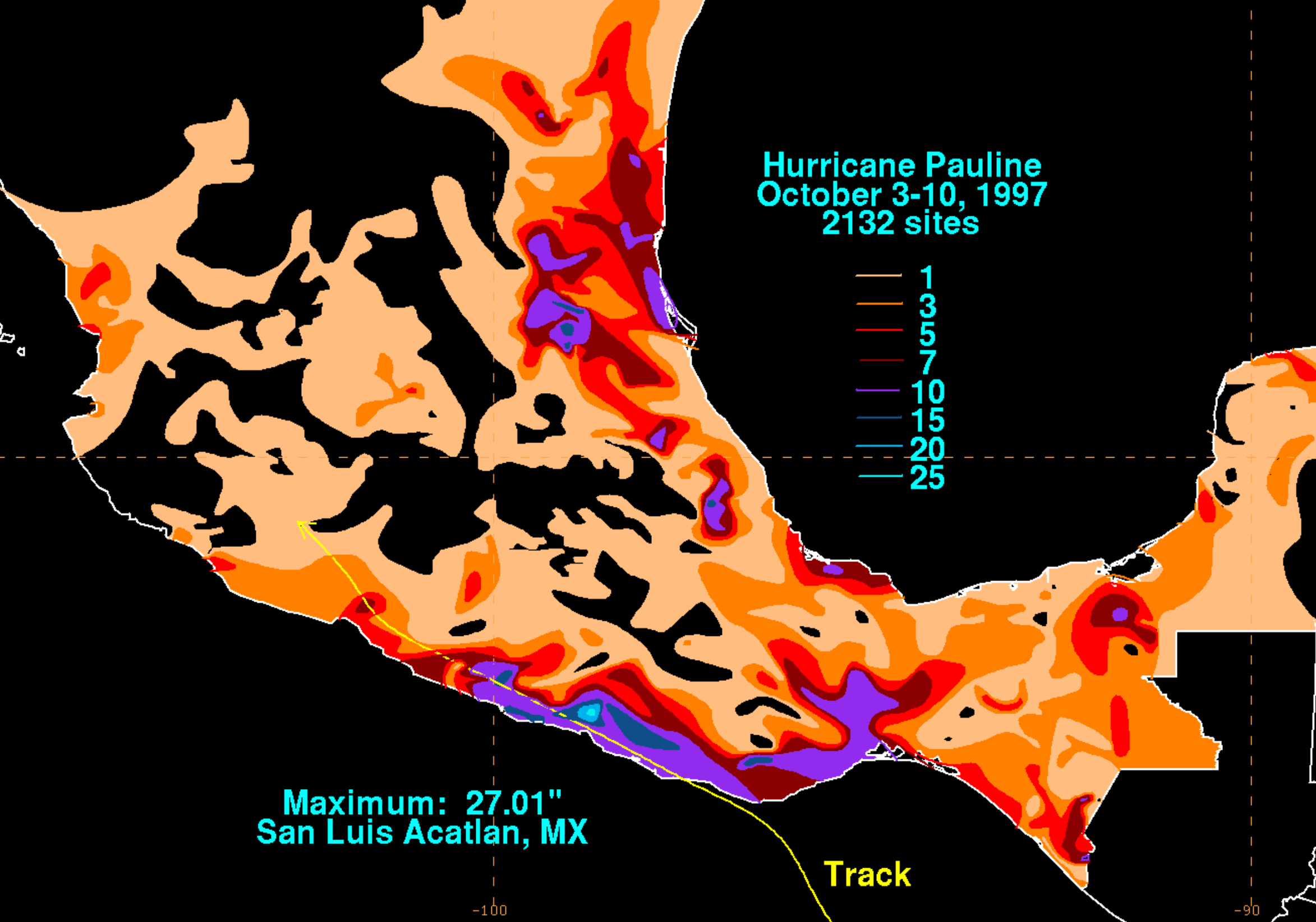 Hurricane Pauline, a compact Category 4 twirler at her peak, was a true natural disaster for the people of southwest Mexico. After her initial tantrum at landfall as a 110 mph Category 2, Pauline slithered begrudgingly down the coastline with disastrous consequences, dumping widespread rainfall totals of 15+ inches, with peak recordings of ~27 and ~32 inches, at San Luis Acatlan and Paso de Ovejas, respectively. The flooding that ensued was horrific, drowning anywhere from 230 to 2,300 people in the region. Acapulco and its surrounding fiefdom was the hardest hit—in just 24 hours, Pauline unwelcomely splashed ~17 inches over the city, cultivating and triggering fatal, sudden mudslides in that mountainous, suburban hypanthium. Homes were swept away; entire families disappeared; whole neighborhoods, buried in the thick, viscous consequence of Pauline’s crying tears of agony as she was torn apart by the Mexican mountains. She is, at minimum, the sixth deadliest Pacific Hurricane on record.