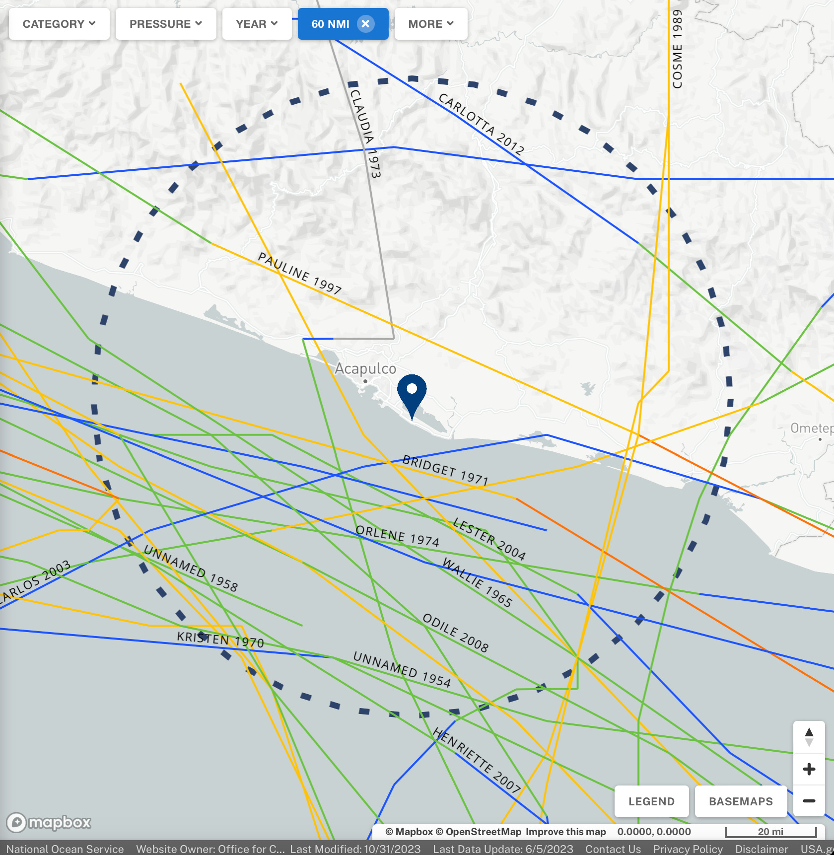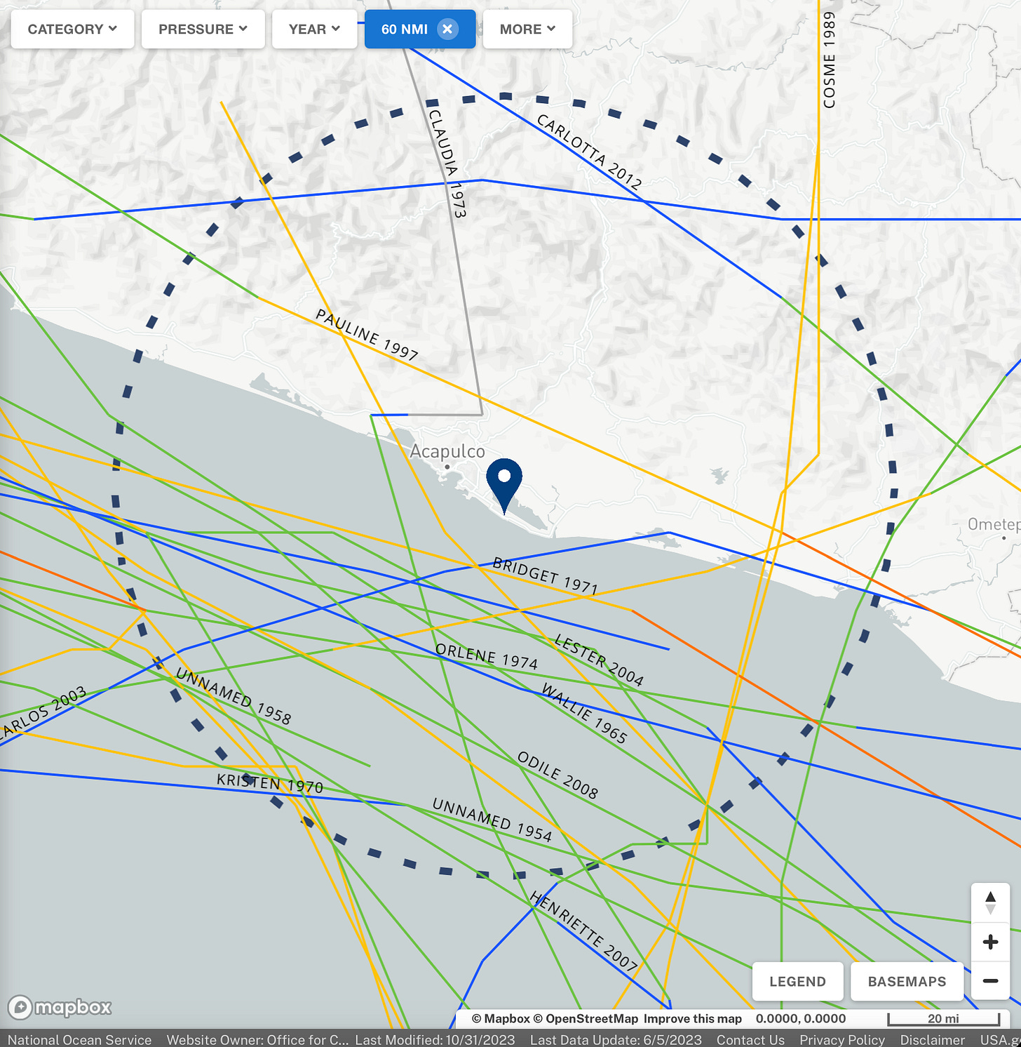 On this map of all known Hurricane tracks within a 60 nautical mile radius of Acapulco, we find that just 1 can even be said to have had a direct-ish landfall over the city: an unnamed 85 mph Category 1 in June of 1951. Outside of this, only 2 other spinners have come even remotely close to directly impacting Acapulco: Bridget in 1971, who caused severe wind and rain damage in the city, and Pauline in 1997—but there’s much more to the story with her.