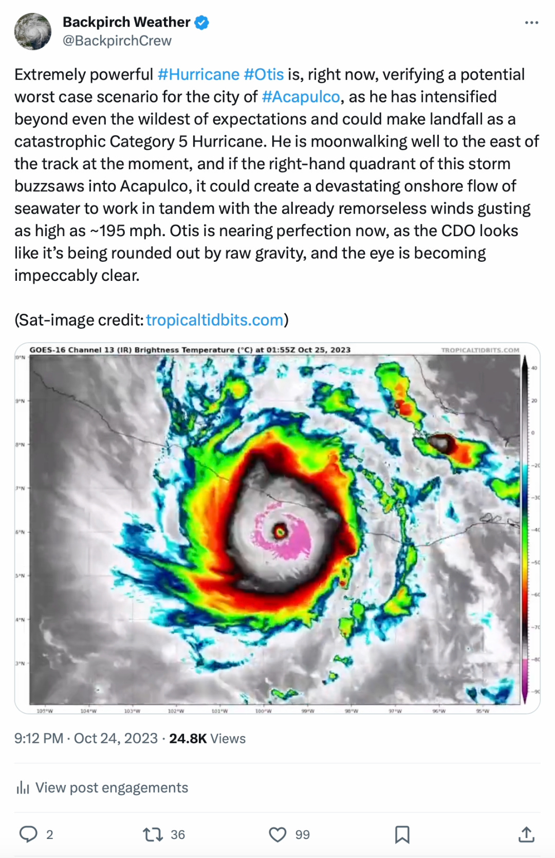 Professional storm chasers around the country were as shocked as anybody, and perhaps even more so. They lived to intercept the cores of Major Hurricane just like Otis, but now they found themselves as helpless outside observers to the approaching storm in Guerrero. Not one of them had planned on meeting up with a meager Tropical Storm/minimal Cat 1 in the middle of southern Mexico—and now, there was quite literally no time left to travel there and record the now-imminent destruction that was methodically marching closer. With just 9 hours left until landfall (which now, very suddenly seemed like a terrifying eternity compared to earlier), the weather-watching-world could only hope to try and warn as many people in the faraway Mexican state as possible.