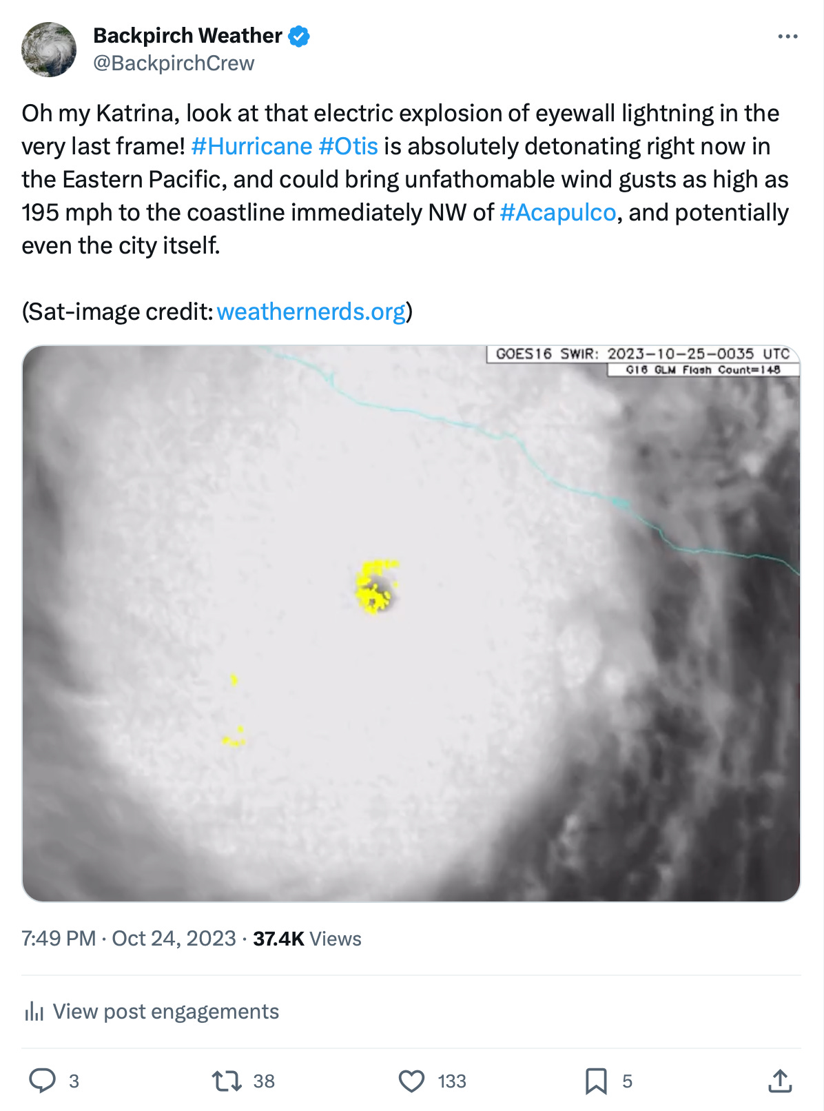 At 11 pm CDT, Hurricane Otis completed his final growth spurt, reaching what would be his peak intensity of 165 mph maximum sustained winds, and a forceful minimum pressure of 923 millibars (he would hold here through landfall), making him the strongest storm of the 2023 Eastern Pacific Hurricane Season. Lightning intensity within the eyewall had reached a new crescendo, firing hotter and faster than ever before. By the time Otis was 45 miles from ground zero, Mexico’s mountains finally had begun to negatively interact with the storm—but it was far too late for Otis to weaken meaningfully.