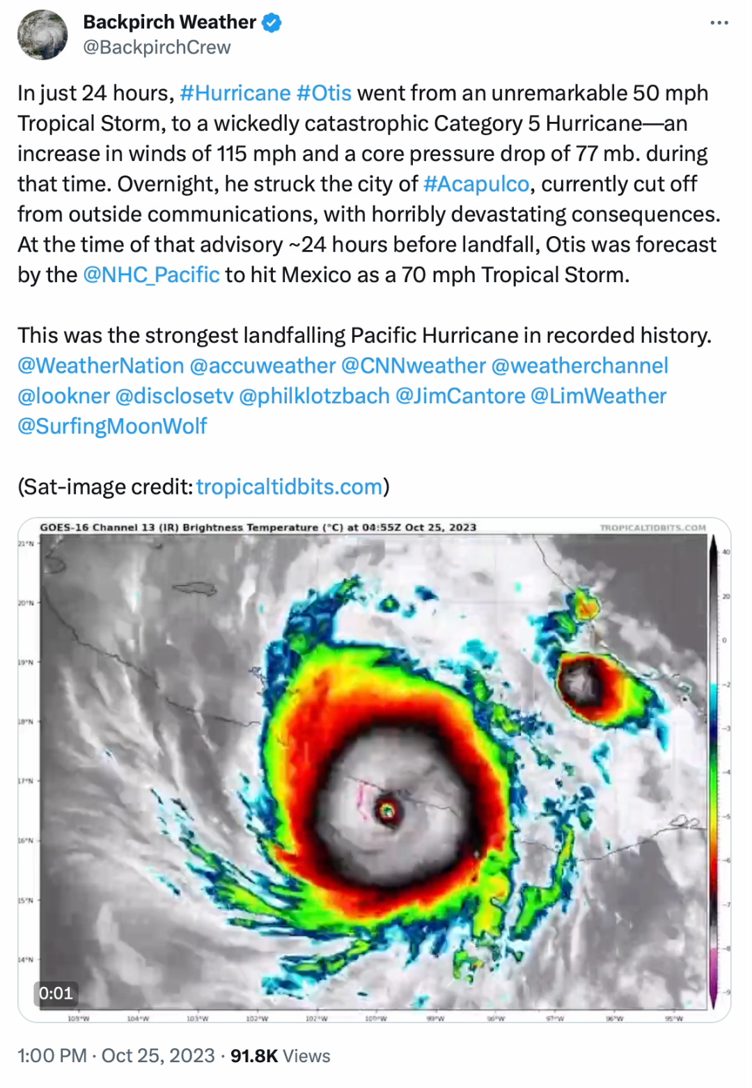 "...EYE OF CATEGORY 5 HURRICANE OTIS ABOUT TO MAKE LANDFALL NEAR ACAPULCO MEXICO... ...CATASTROPHIC DAMAGE LIKELY WHERE THE CORE MOVES ONSHORE..." -National Hurricane Center, Forecaster Brown/Kelly at 1 AM CDT
